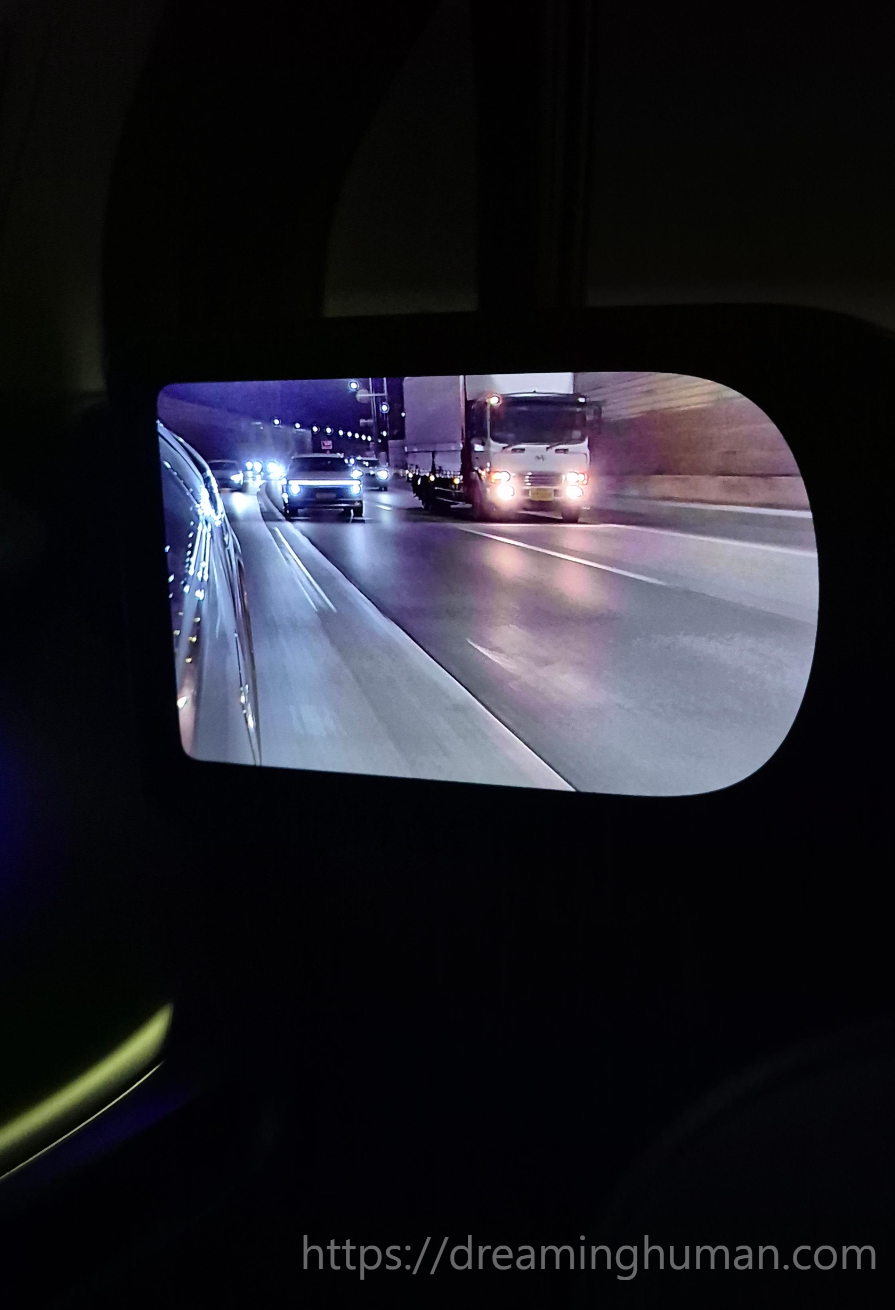 또한, 디스플레이의 화면 품질은 매우 선명하며, 화면 크기도 적절해 운전 중 시야를 가리지 않고 주변 상황을 직관적으로 확인할 수 있습니다. 브레이크를 밟으면 브레이크등이 들어오는 것 처럼 디지털 사이드미러에도 빨간 불이 들어옵니다. 저에겐 이런 기능들이 처음 접해보는 기능이라 마냥 신기하고 좋게 느껴졌습니다.